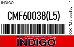 | 118246 | INDIGO | CMF60038(L5) | INDIGO CMF60038(L5) Аккумулятор CMF 60038 (L5) euro (Юж.Корея), 100Ач, 740А, 351х174х189мм | 3 | 15050 | Только для отправки по России. |  |