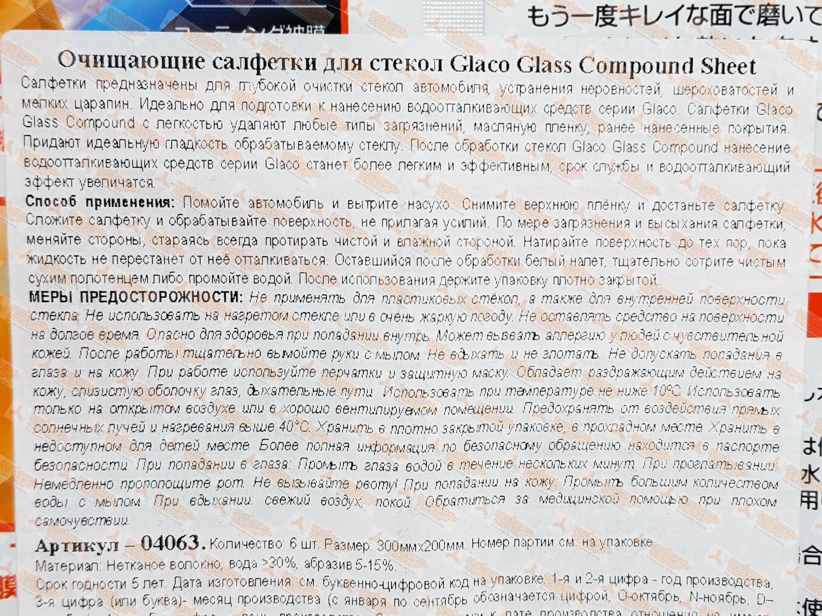 | 122678 | SOFT99 | 04063 | SOFT99 04063 Салфетки для стекол очищающие Glaco Compound Sheet, 6 шт | 50 | 500 | Только для отправки по России. |  |
