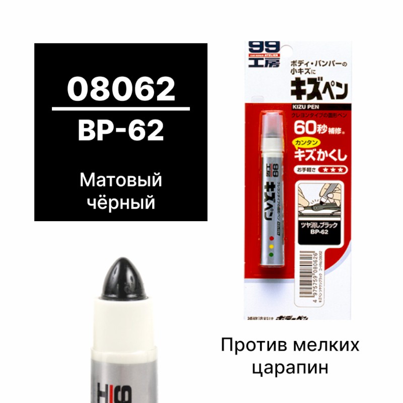 | 124357 | SOFT99 | 08062 | SOFT99 08062 Краска-карандаш для заделки царапин KIZU PEN матово-черный, карандаш, 20 гр | 50 | 350 | Только для отправки по России. |  |