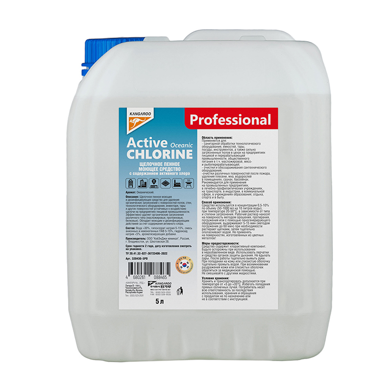 | 131362 | KANGAROO | 320430-5PO | KANGAROO 320430-5PO / 3204305PO Professional Active chlorine Oceanic Щелочное пенное моющее средство с содержанием активного хлора с ароматом «Океанический», 5л | 50 | 1250 | Только для отправки по России. |  |