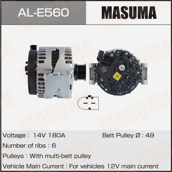| 147214 | Masuma | AL-E560 | Masuma AL-E560 / ALE560 Генератор , MERCEDES-BENZ / M 272 (14V/180A) | 3 | 23400 | Только для отправки по России. |  |