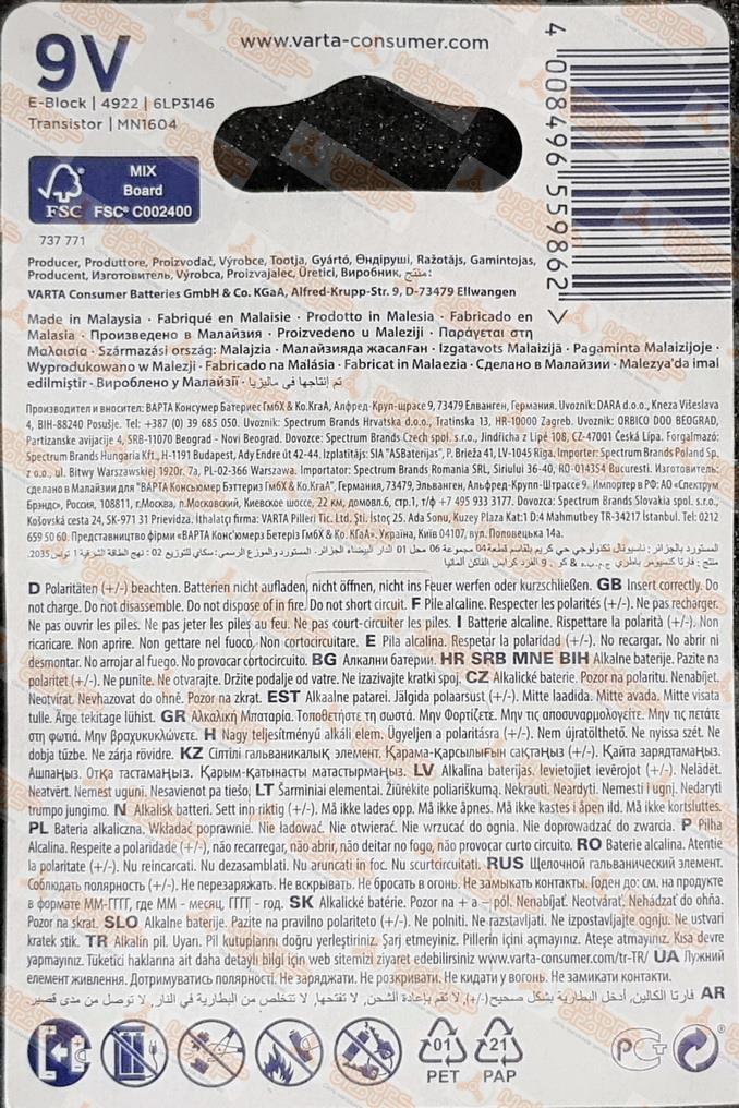 | 19603 | VARTA | 6LR61 | VARTA 6LR61 Батарея ENERGY 9V Крона (4122/6LP3146) | 4 | 350 | В наличии. |  |