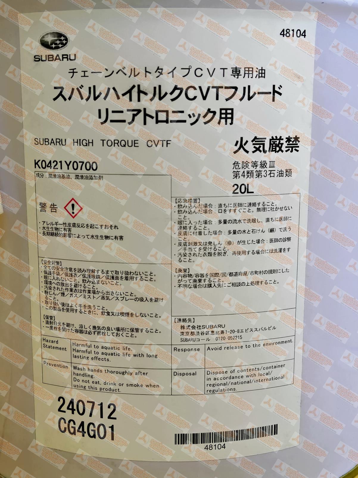 | 30113 | SUBARU | K0421-Y0700 | SUBARU K0421-Y0700 / K0421Y0700 Масло (жидкость) вариатора HIGH TORQUE CVTF ведро 20 л | 1 | 39950 | В наличии. |  |